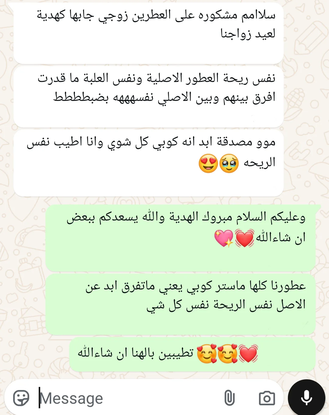 العطور لدينا صنف Copy Master – الإصدار الأول، وهي أعلى جودة في السوق. تُصنّع في نفس خطوط الإنتاج التي تُصنَّع فيها العطور الأصلية وبنفس المواد الأساسية، لذلك تمنحك نفس الرائحة، نفس الثبات، نفس الفوحان، وحتى نفس جودة العبوة. مناسب لك تماماً إن كُنت مُهتم بالحصول على العطر الخاص بالماركة المفضلة لديك ولكن بسعر أقل.